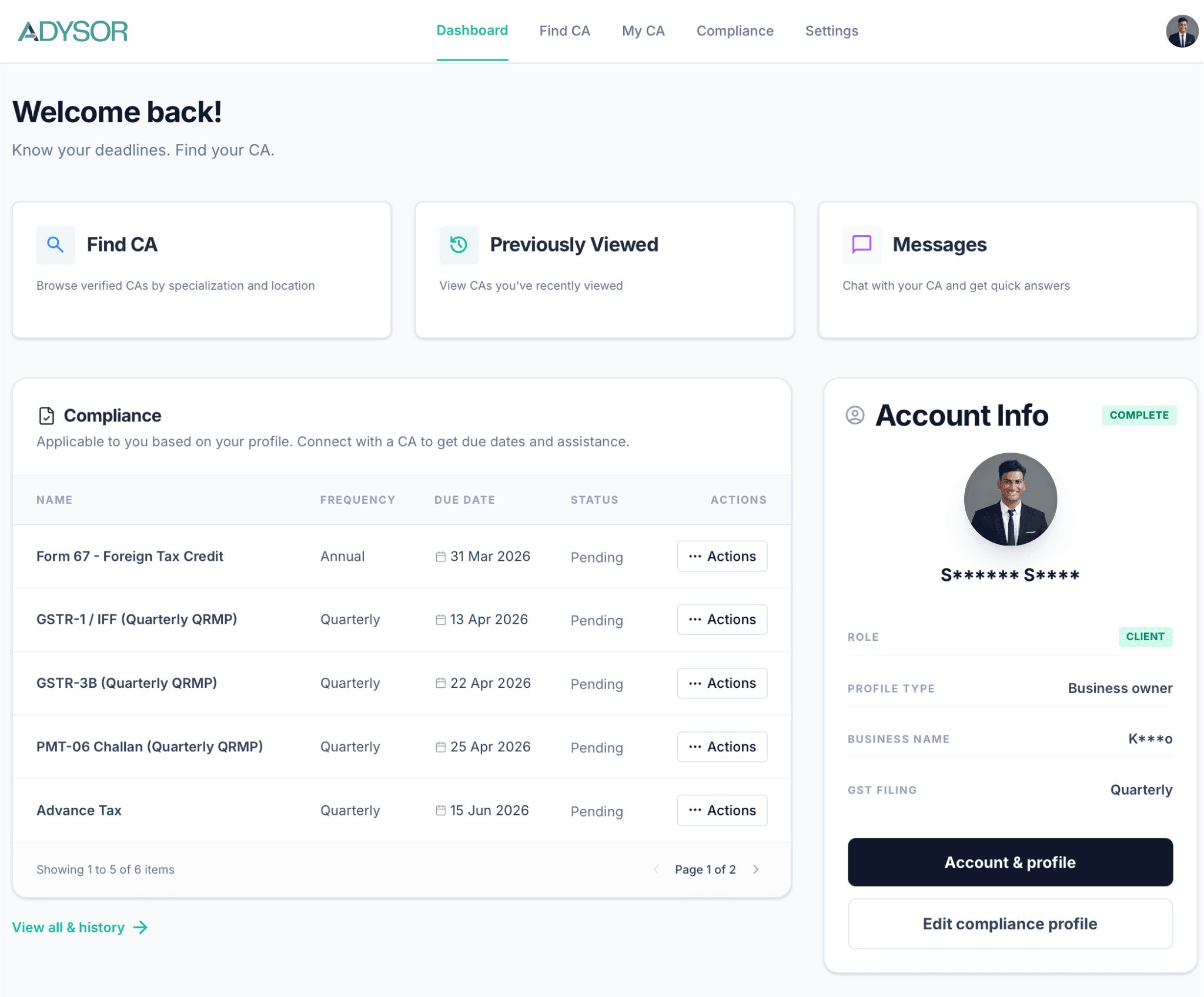 Once you connect, all work moves into your Adysor workspace. You’ll be able to track service status, see pending action items, upload documents, and communicate with your CA without relying on email or WhatsApp.