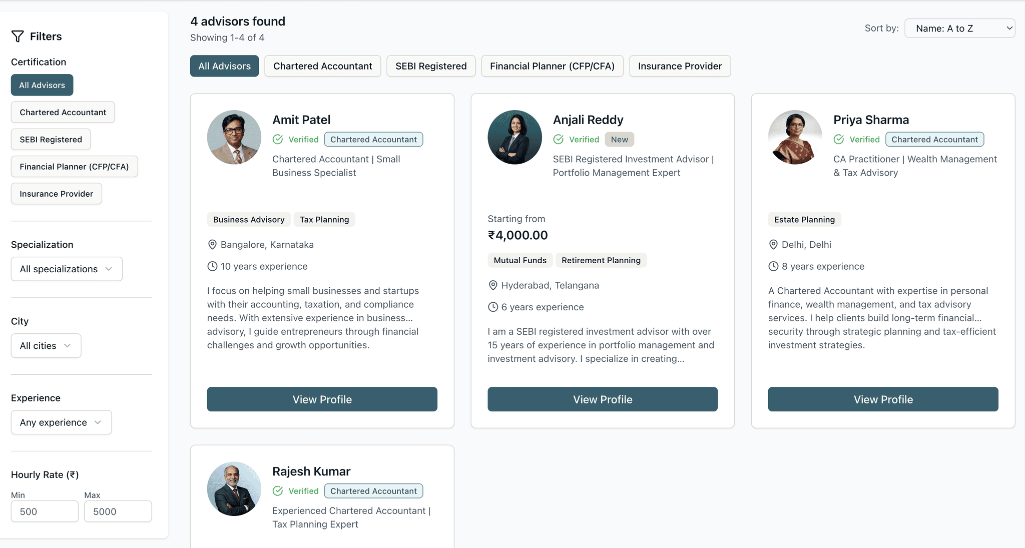 You’ll find verified, regulated professionals — including Chartered Accountants (CAs) and other financial advisors — who help with tax planning, compliance, investments, insurance, and long-term wealth decisions.