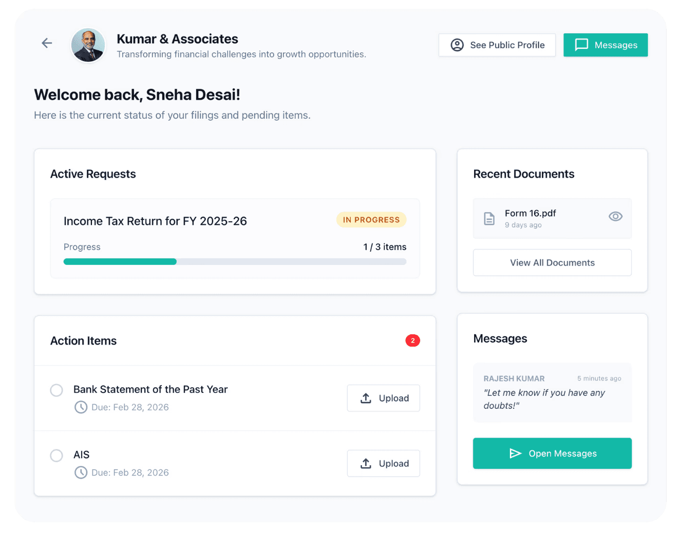 A compliance-first platform that helps Chartered Accountants get discovered, manage client work, and stay future-ready without violating ICAI norms.